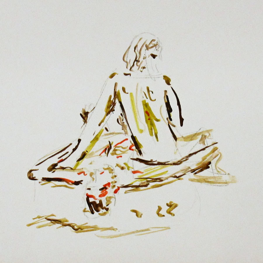 Two poses occupied the second half: 30-minutes sitting on the floor, and 25-minutes seated upon a high stool. These enabled us to over-run the session by 5-10 minutes as compensation for our late start. Honour was satisfied; I hope the artists were too. Certainly Stephen was more relaxed than when I found him. He’d reached a point of confronting the real possibility of having to model himself. I felt guilty for bringing him to that precipice – but, who knows, maybe one day he’ll want to take the plunge.